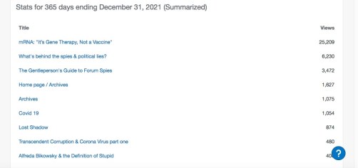 Dr David Martin’s article “mRNA: It’s Gene Therapy, Not a Vaccine” brought 25,000+ views or nearly one half of the year’s article stats. This statistic would have been by far larger but the duckduckgo search engine adjusted its algorithms to bury the article, while noting google had done this to restrict ronaldthomaswest.com articles years ago. The David Martin article is not suppressed at Bing but the Microsoft search engine sees miniscule use by comparison.